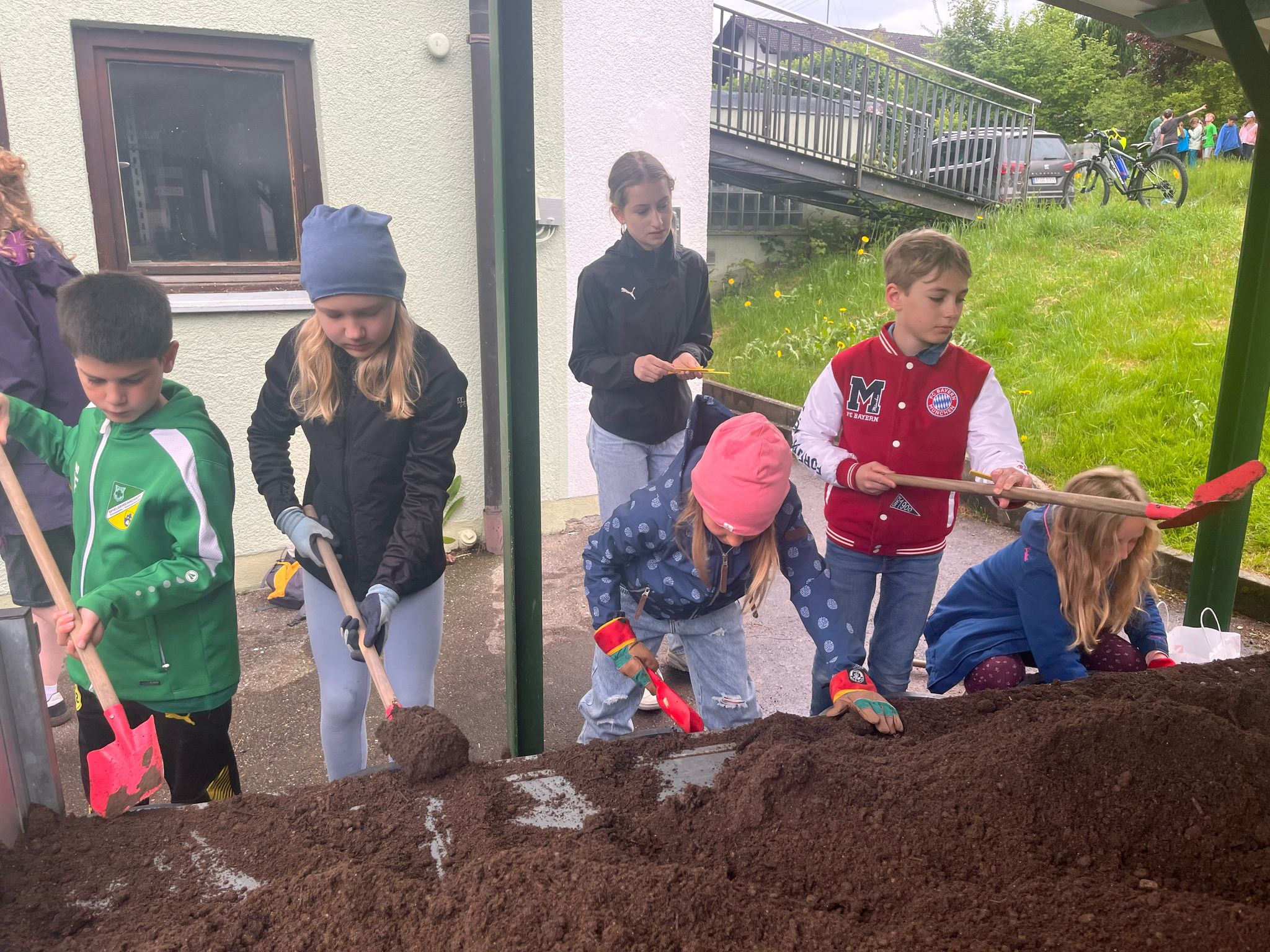 Für die großen Diebelfrösche der 4. Klasse stand zum Abschluss noch ein weiteres Projekt an: das Einpflanzen von Kartoffeln. Dazu wurde kräftig Erde in große Pflanzgefäße geschaufelt, und die vorgekeimten Kartoffeln – die jedes Kind zuvor zuhause vorbereitet hatte – fanden schließlich ihren Platz in der Erde. Nun heißt es: regelmäßig gießen, pflegen und gespannt beobachten, wie aus den kleinen Knollen bald grüne Pflanzen wachsen.